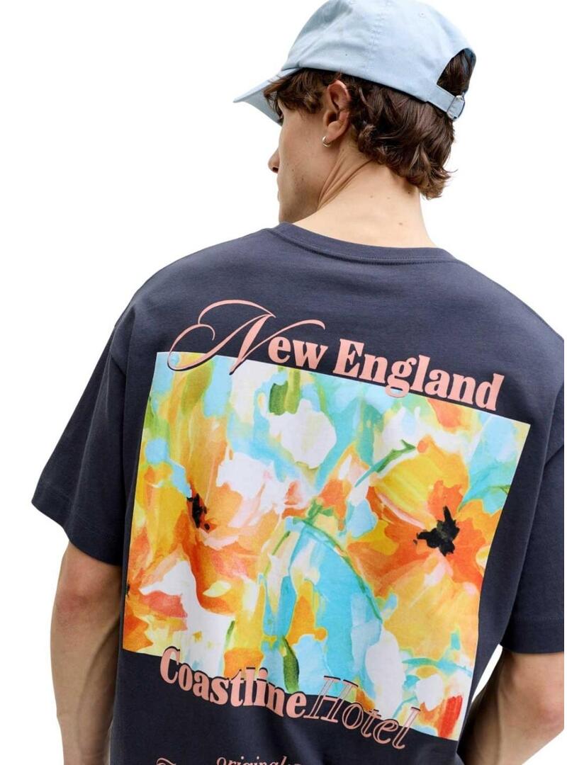 Maglietta Jack and Jones. Modello Montauk. Colore blu. Collo rotondo. Manica corta. Vestibilità ampia. Illustrazione stampata sulla schiena. Messaggio stampato sul petto.