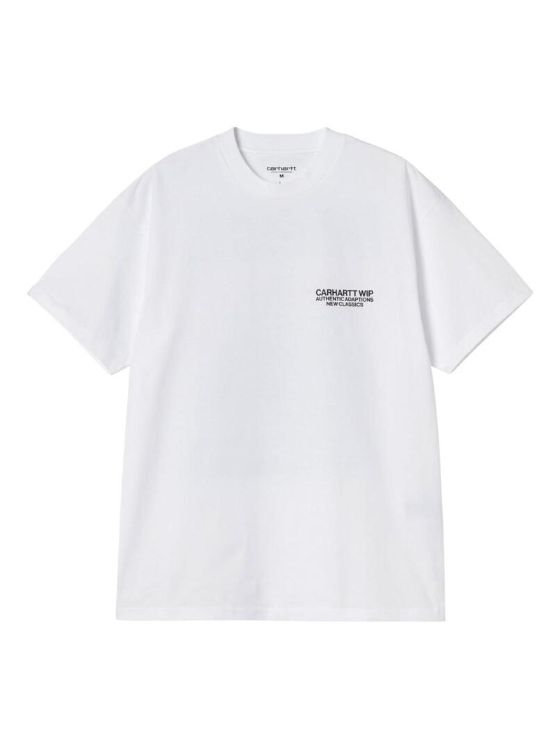Maglietta Carhartt. Modello Sean Hamilton. Colore bianco. Girocollo. Manica corta. Vestibilità ampia. Marchio stampato sul petto. Immagine di una ruota con catene stampata sul retro.