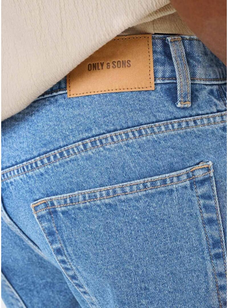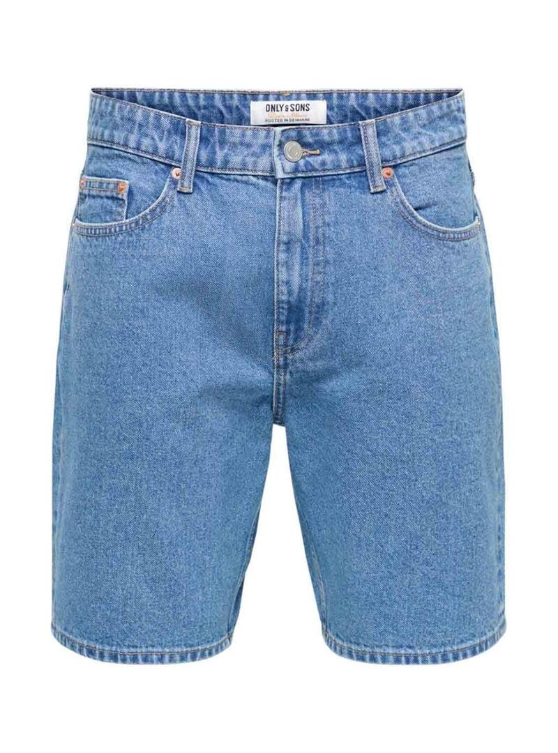 Bermuda Only and Sons. Modello Sedge. Colore blu. Denim medio. Chiusura con bottone e zip. Taglio dritto. Cinque tasche. Patch del marchio in vita.