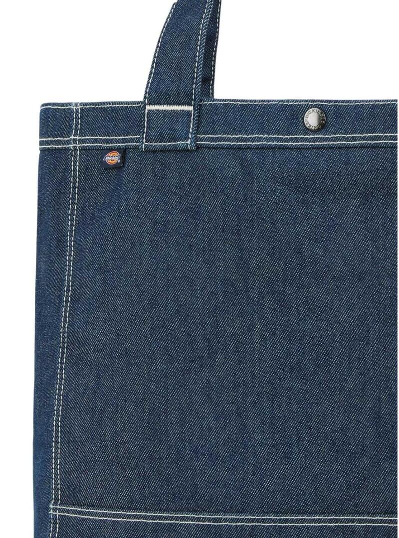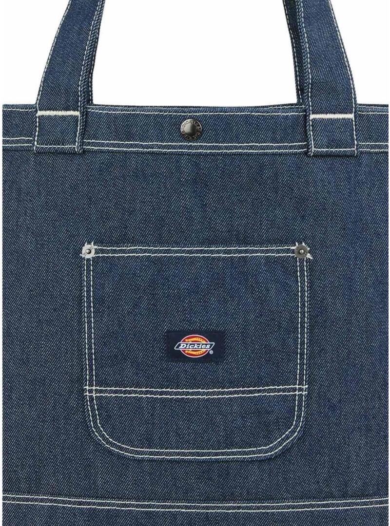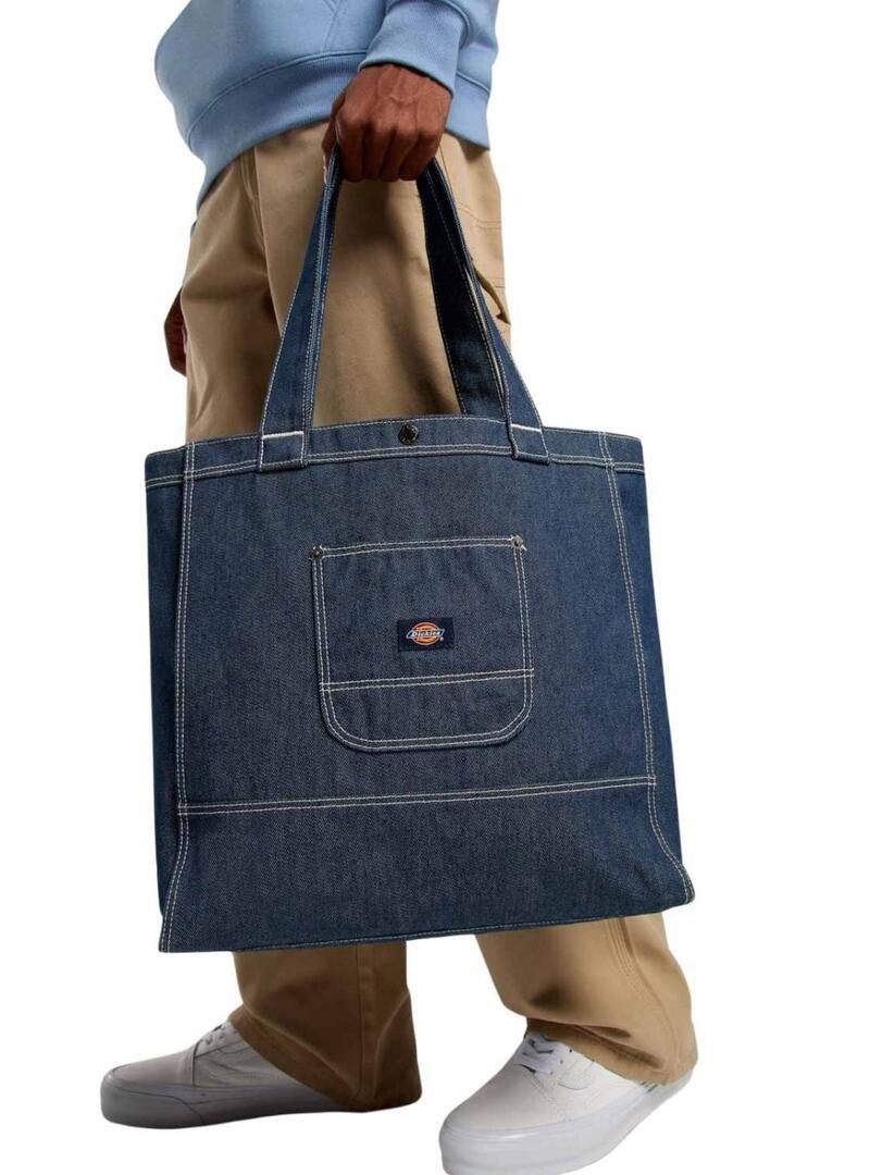 Borsa Dickies. Modello Tote. Denim scuro. Cuciture a contrasto. Tasca esterna con etichetta del marchio. Doppio manico superiore. Dimensioni: 37 x 39 x 14 cm. Capacità: 20 L.