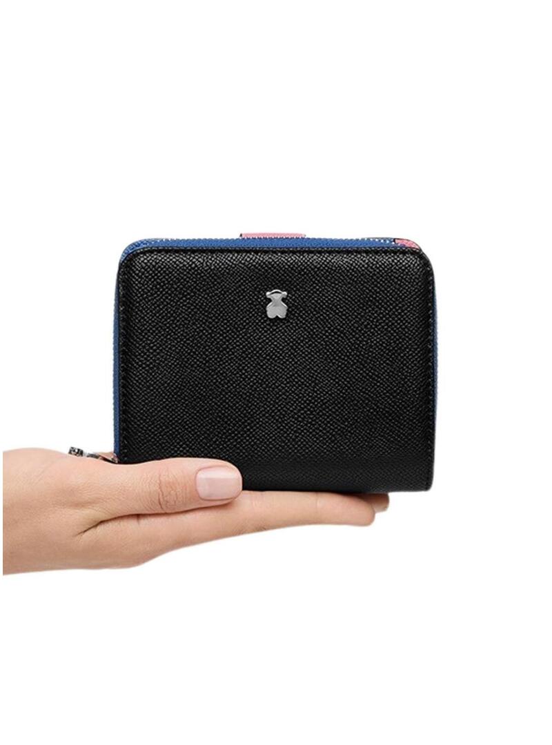 Portafoglio Tous. Colore nero. Realizzato in poliuretano con effetto saffiano. Dettagli in colore blu e rosa. Chiusura con bottone a pressione e zip. Due scomparti principali: uno con zip e uno per le carte. Misure: 12 x 10 x 3 cm.