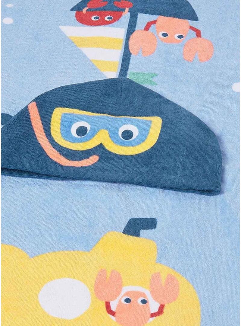 Coperta da bagno Mayoral per bambini di colore blu con stampa marina e divertente disegno di un sottomarino. Include un cappuccio per avvolgere meglio il bambino dopo il bagno e offrire maggiore comfort. Il suo design allegro, pieno di animali marini e dettagli del fondale marino, la rende una scelta pratica e originale per tutti i giorni.