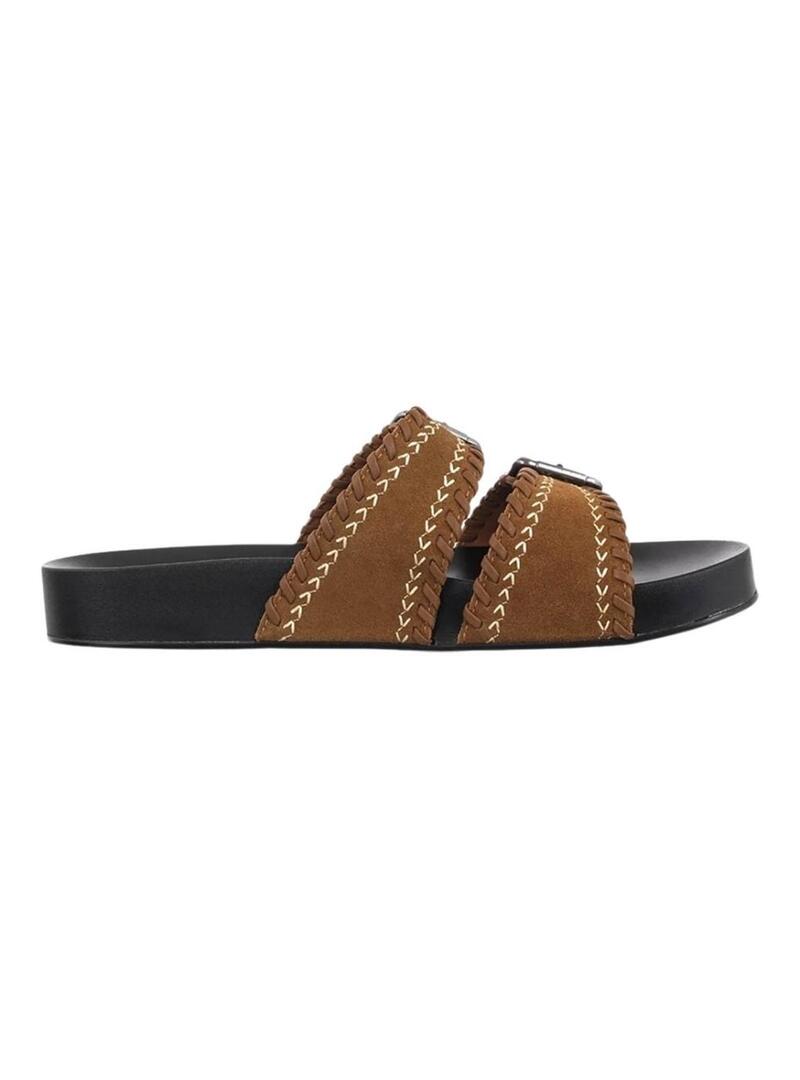 Sandali Pepe Jeans. Modello Agnes. Colore marrone. Doppia cinghia superiore con cuciture a contrasto. Chiusura con fibbie metalliche. Tomaia in camoscio marrone. Suola in gomma nera.