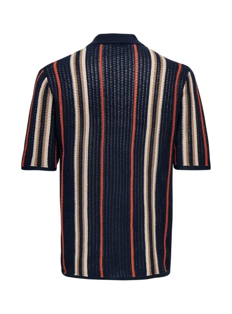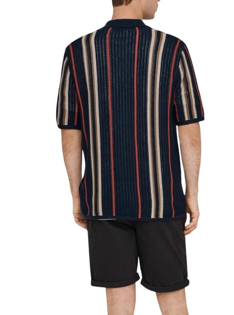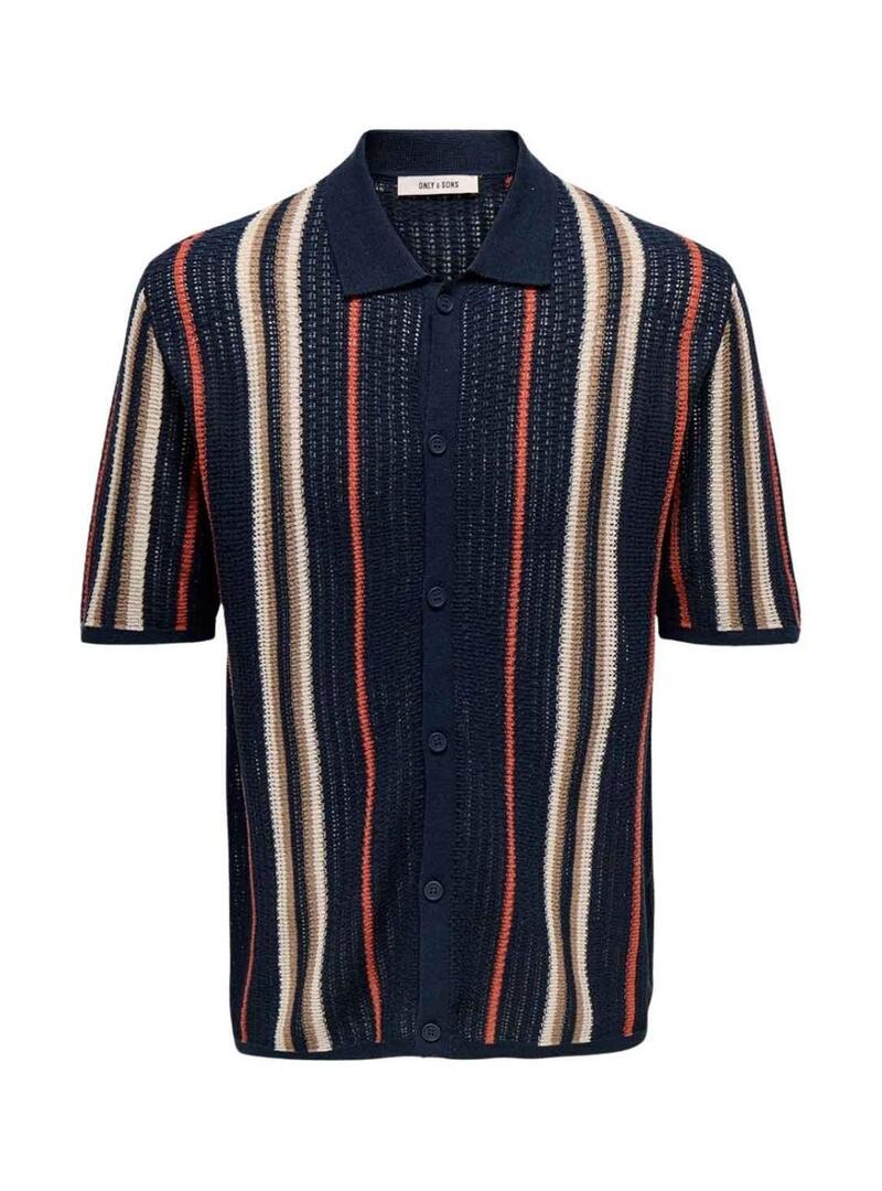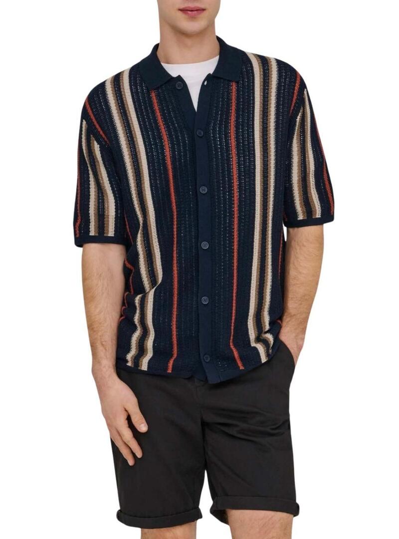 Polo Only and Sons. Modello Leon. Colore blu scuro. Stile cardigan. Chiusura con bottoni frontali. Manica corta. Colletto a camicia. Vestibilità oversize. Maglia a righe verticali in colore.