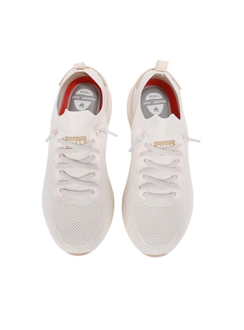 Scarpa da ginnastica Walkin Pitas. Modello Cue. Colore sabbia. Chiusura con lacci elastici. Realizzato in poliestere riciclato da bottiglie PET. Tomaia in maglia traspirante. Soletta in memory foam rimovibile. Suola Comfort da 3 cm realizzata in EVA ultraleggera.