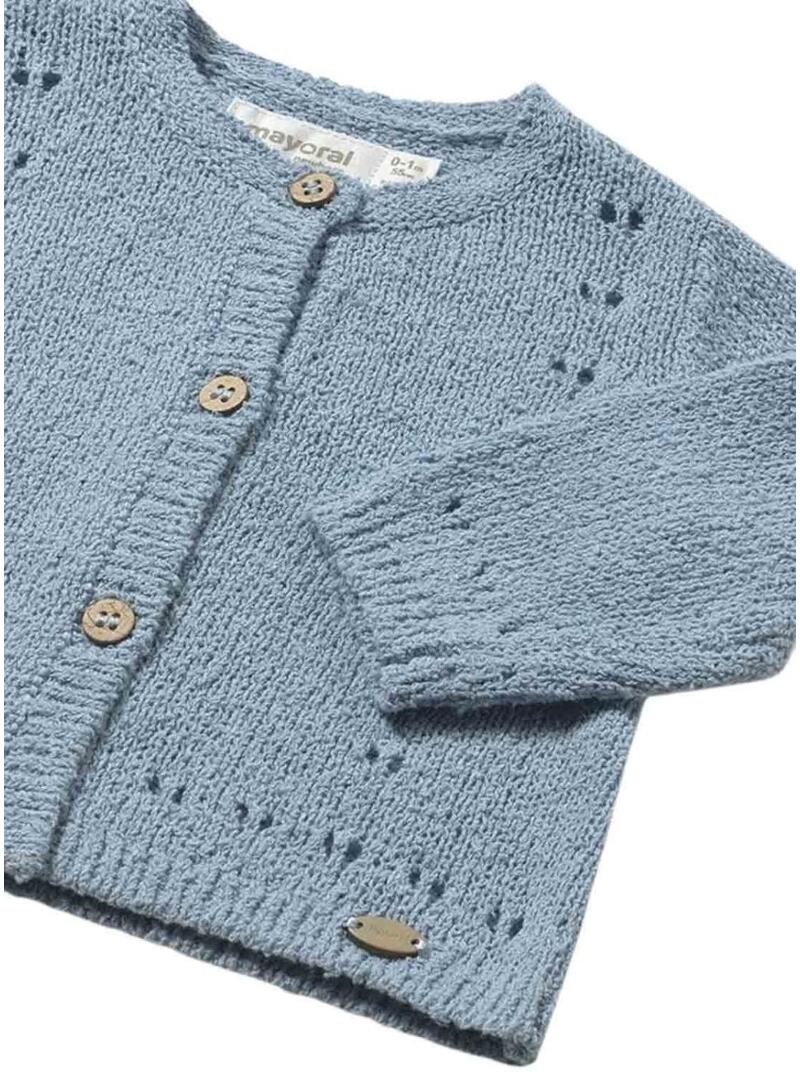 Giacca Mayoral a maglia in colore azzurro cielo, ideale per completare i look del bambino con un tocco dolce e delicato. Ha un collo rotondo, chiusura frontale con bottoni di legno e dettaglio traforato che conferisce un tocco speciale ed elegante.