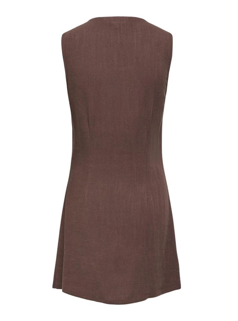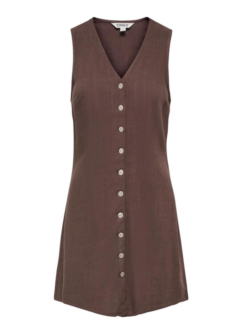 Abito Only. Modello Siesta. Colore marrone. Scollatura a V. Chiusura con bottoni frontali. Taglio mini. Senza maniche. Leggermente aderente in vita.