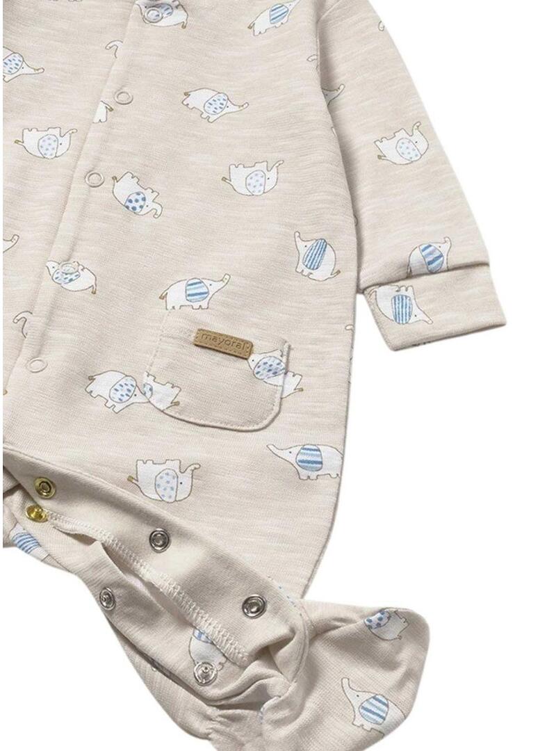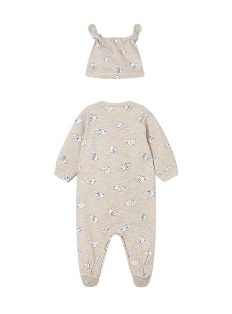 Set tutina e berretto Mayoral stampato elefanti color sabbia per neonato.