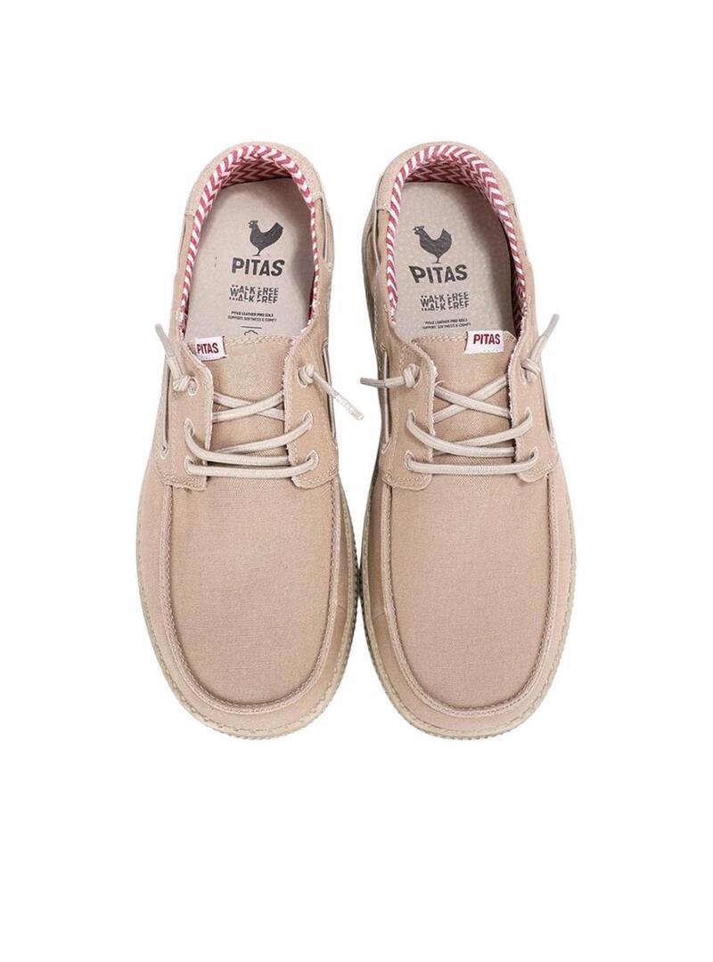 Scarpe Walkin Pitas. Modello Como. Colore beige. Realizzato in cotone e camoscio. Ultraleggero e flessibile. Stile marinaio. Tessuto traspirante. Fodera con stampa geometrica in rosso. Lacci elastici. Soletta estraibile. Suola di 2,5 cm in EVA ultraleggera.