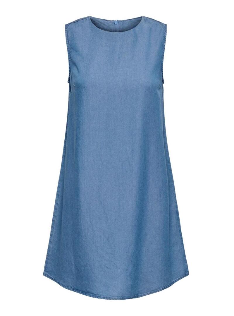 Abito Only. Modello Charis. Colore blu. Collo tondo. Senza maniche. Taglio mini. Stile babydoll. Chiusura con zip posteriore. Tessuto leggero.