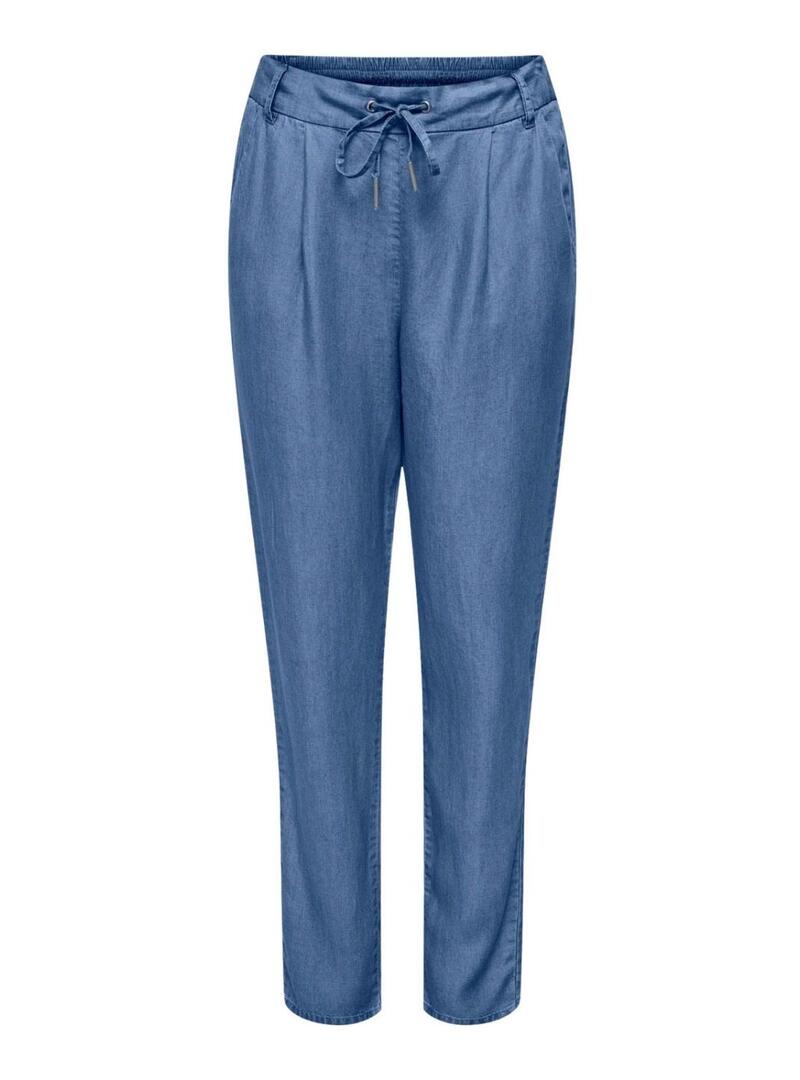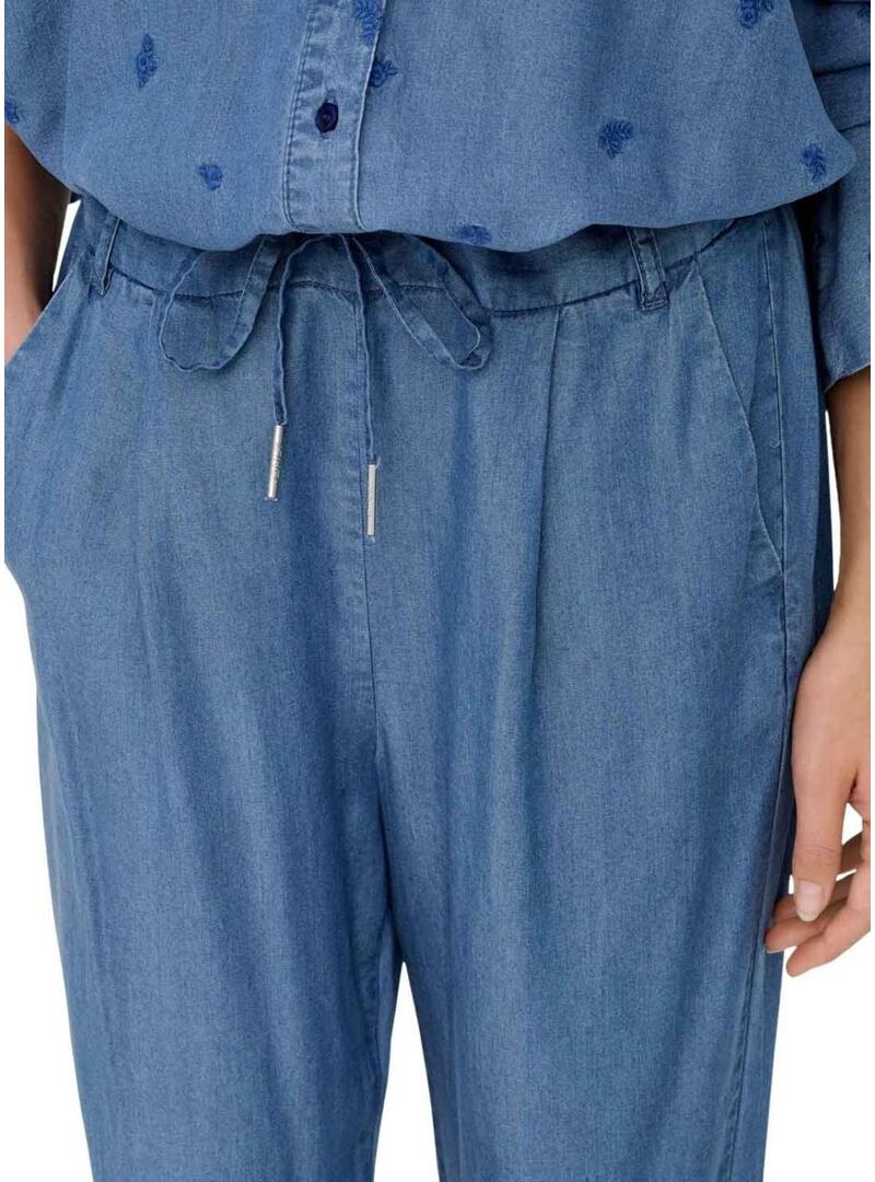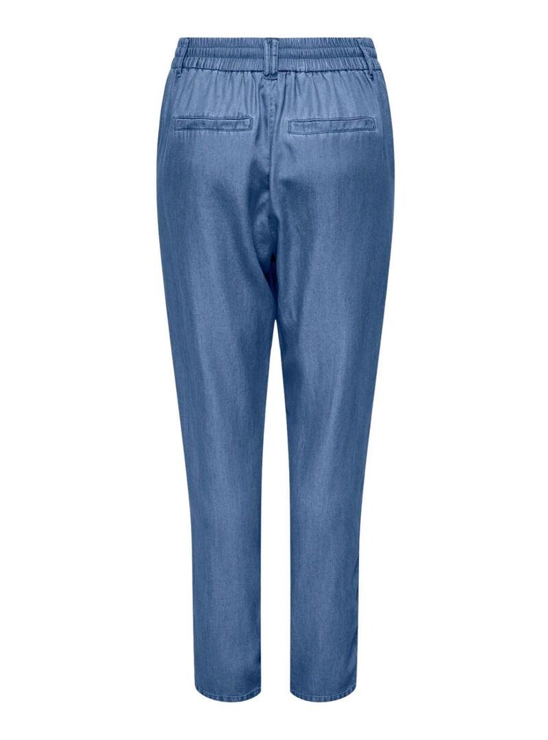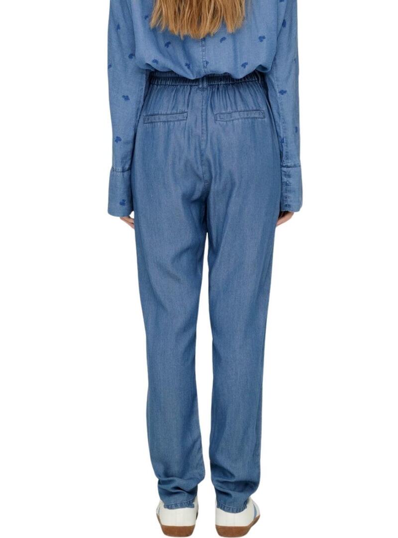 Pantaloni Only. Modello Poptrash Charis. Colore blu. Tessuto leggero dall'aspetto denim. Vita alta. Vita elastica con coulisse. Tasche laterali. Finti tasche a filetto posteriori. Vestibilità slim.