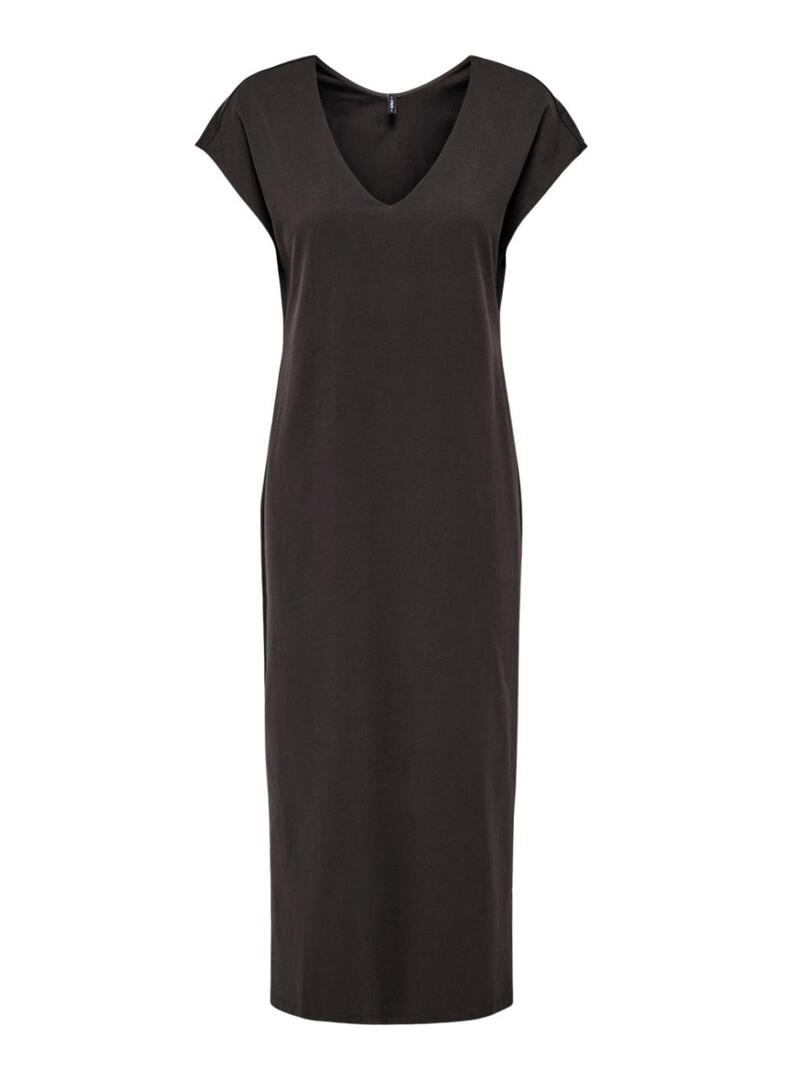 Abito Only. Modello Mara. Colore marrone cioccolato. Realizzato in cotone. Manica corta. Lunghezza midi. Scollo a V. Apertura laterale. Stile basic.