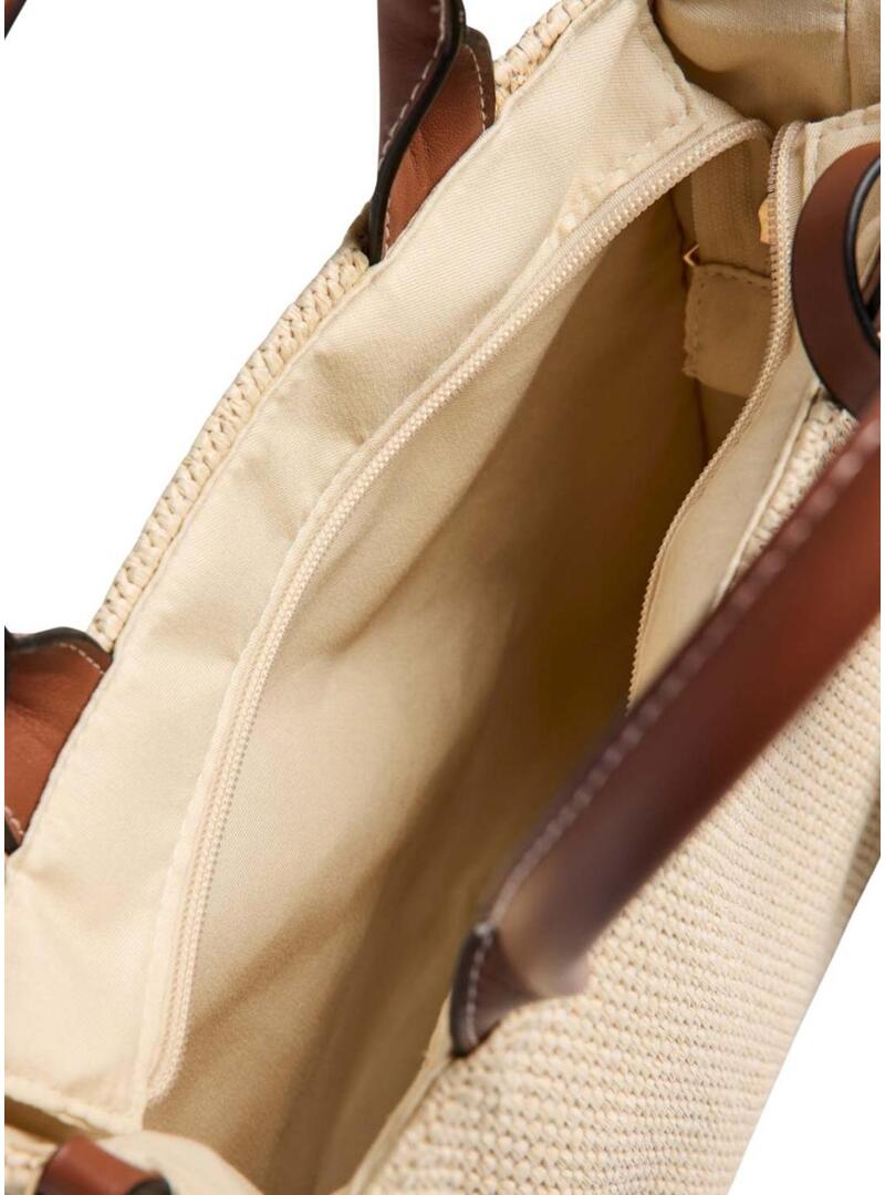 Borsa Pieces. Modello Kathrine. Colore beige. Dettagli in ecopelle marrone. Doppio manico superiore. Tracolla regolabile e rimovibile. Stile rettangolare. Misure: 27 cm (larghezza) x 22 cm (altezza) x 8 cm (profondità).