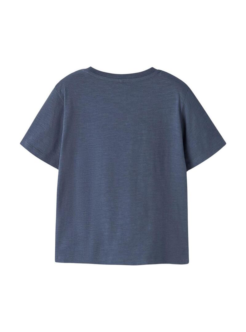 Maglietta Name It. Modello Feath. Colore blu. Manica corta. Spalle leggermente cadenti. Collo rotondo a costine. Dinosauro stampato nella parte anteriore. Taglio regolare.