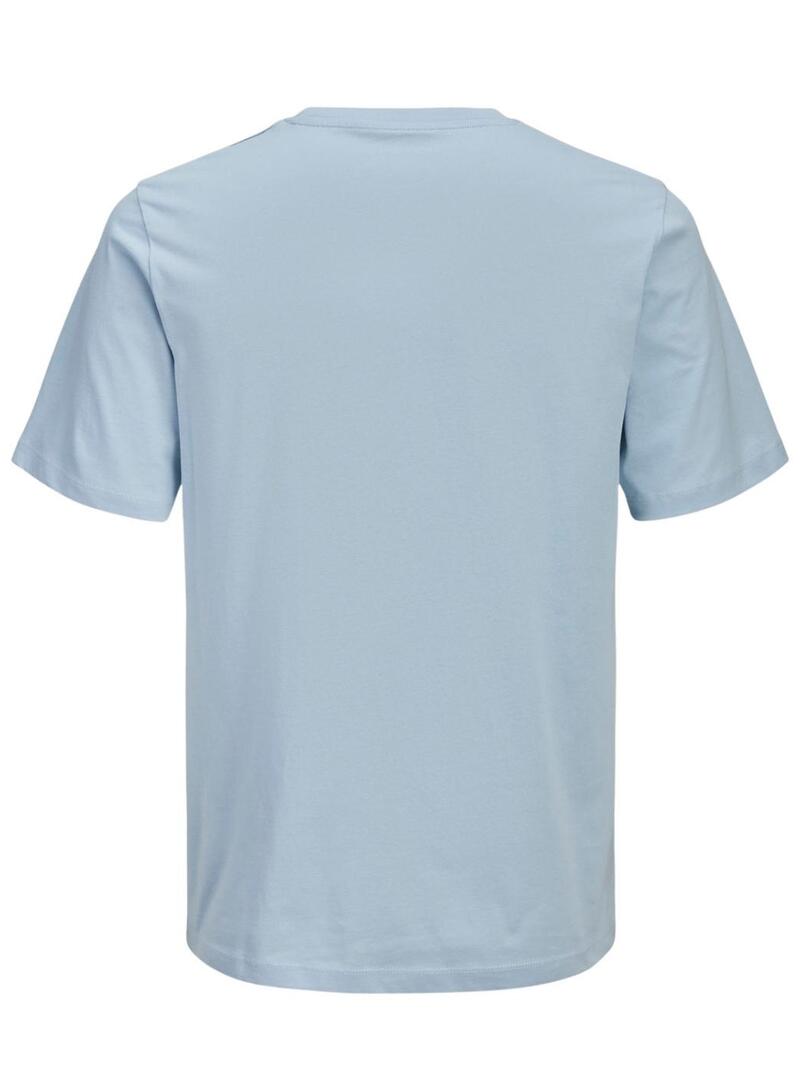 Maglietta Jack and Jones. Modello Rain. Colore blu. Collo rotondo a costine. Manica corta. Grafica stampata sulla parte anteriore. Taglio regolare.