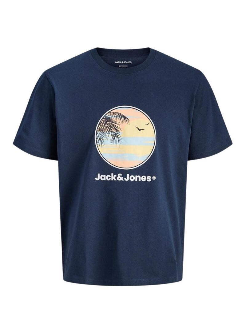 Maglietta Jack and Jones. Modello Perry. Colore blu scuro. Collo rotondo. Manica corta. Stampa estiva sul petto. Logo stampato sul petto. Taglio regolare.