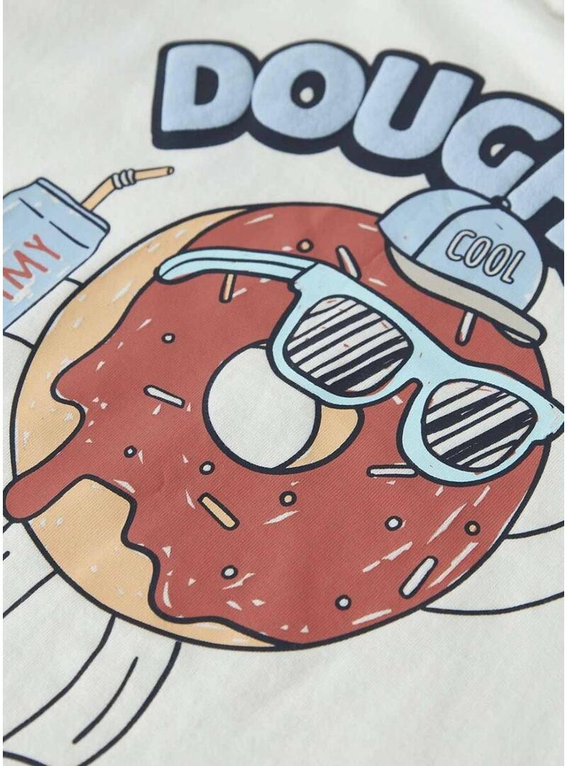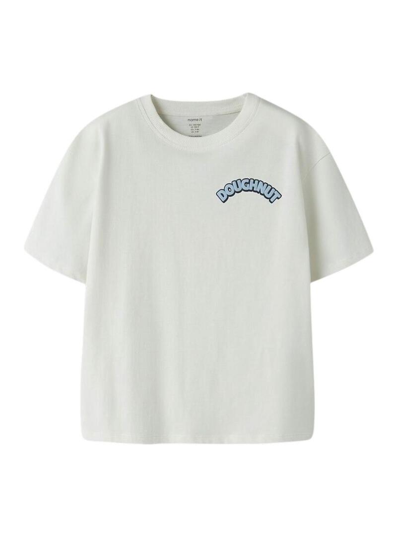 Maglietta Name It. Modello Foxe. Colore bianco. Girocollo. Manica corta. Testo stampato sul petto. Ciambella stampata sulla schiena. Formato rilassato. Spalle cadenti.