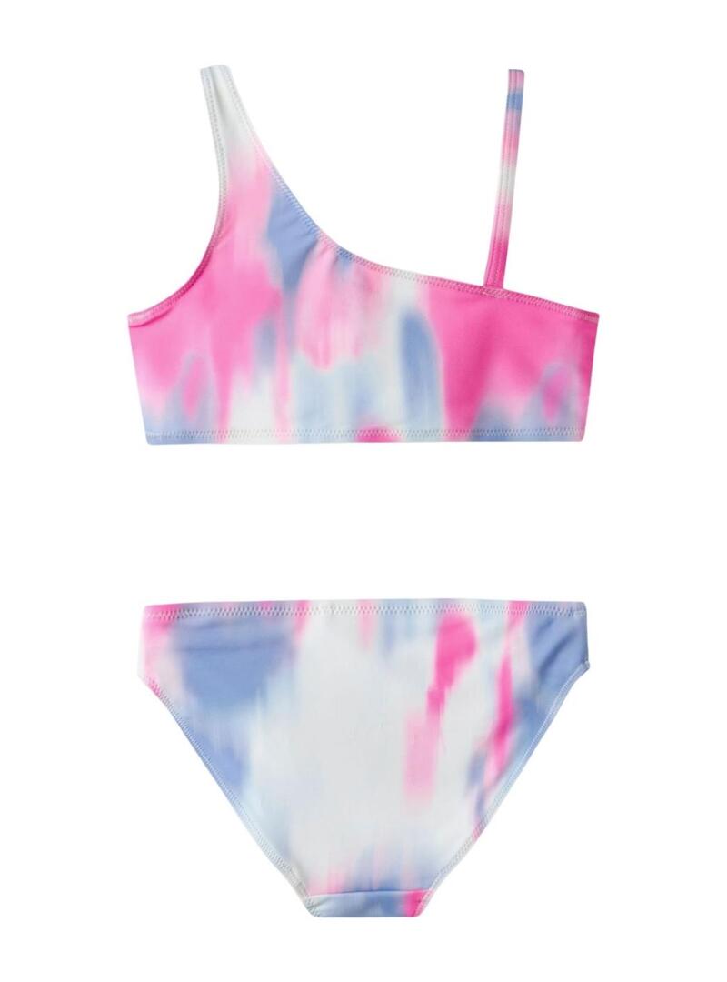 Bikini Name It. Modello Zie. Stampa in colori blu, rosa e bianco. Scollatura asimmetrica. Fodera in poliestere. Una spallina sottile.