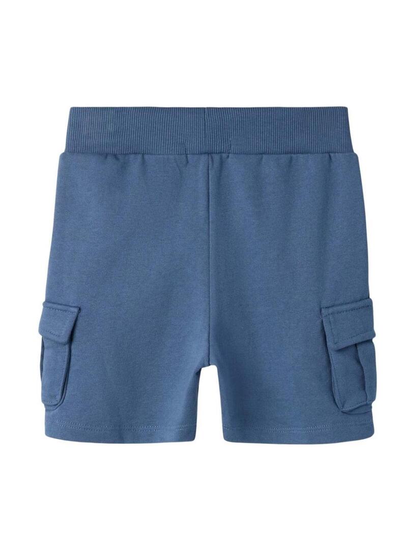 Bermuda Name It. Modello Oli. Colore blu. Tessuto morbido in cotone. Vita regolabile con coulisse. Vita elastica. Tasche laterali. Due tasche cargo. Taglio regolare.