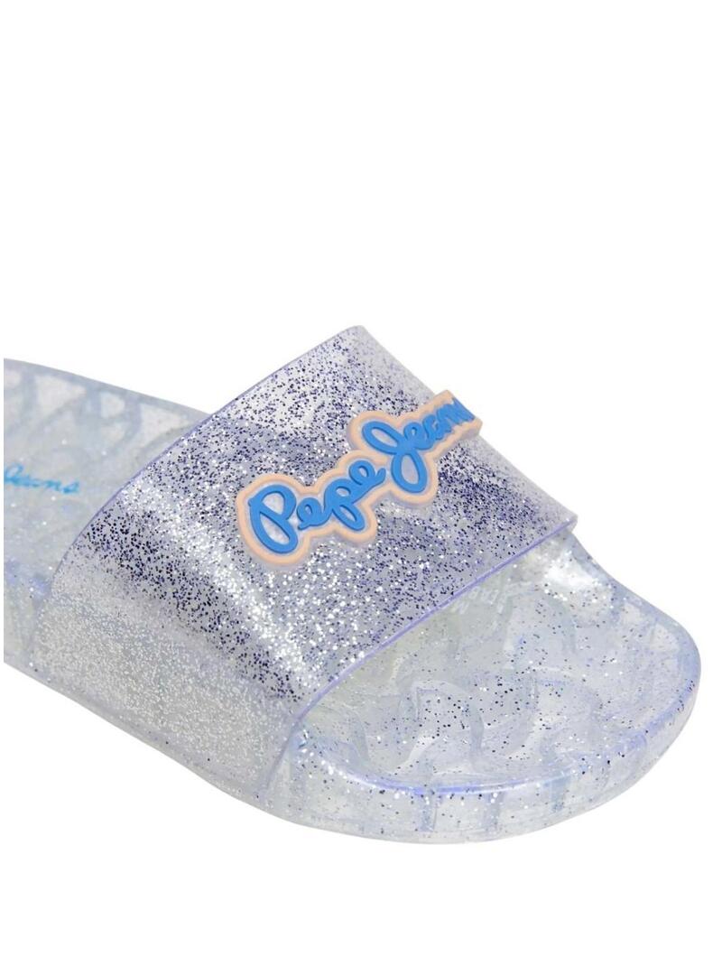 Infradito Pepe Jeans. Realizzati in PVC trasparente. Dettagli di glitter. Fascia larga. Logo in rilievo. Pepe Jeans in contrasto sulla fascia. Soletta anatomica con logo stampato. Suola con disegno antiscivolo.