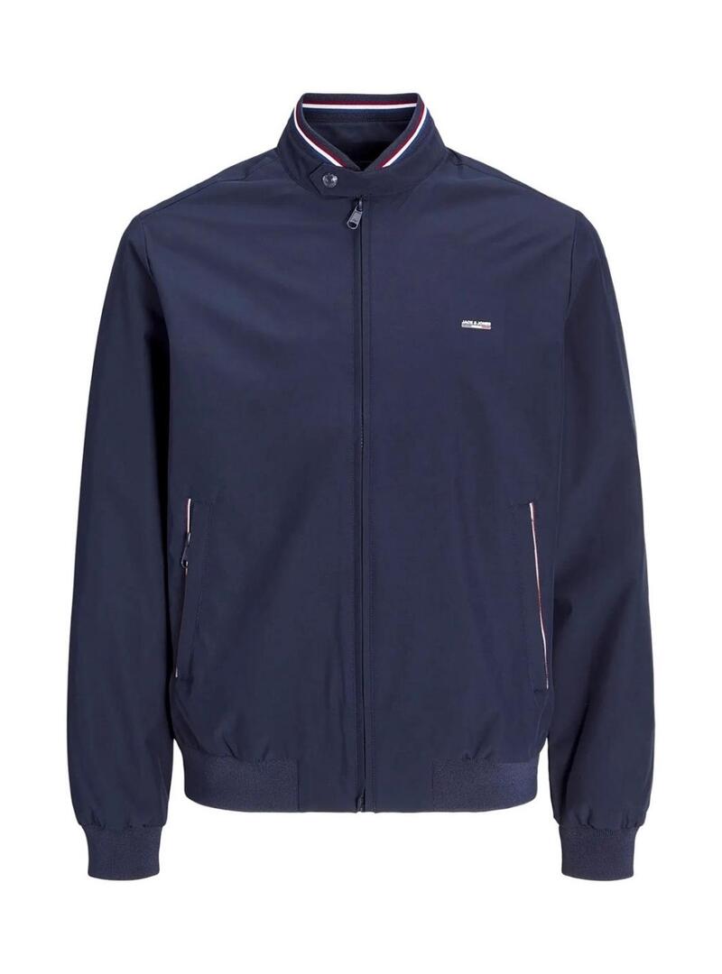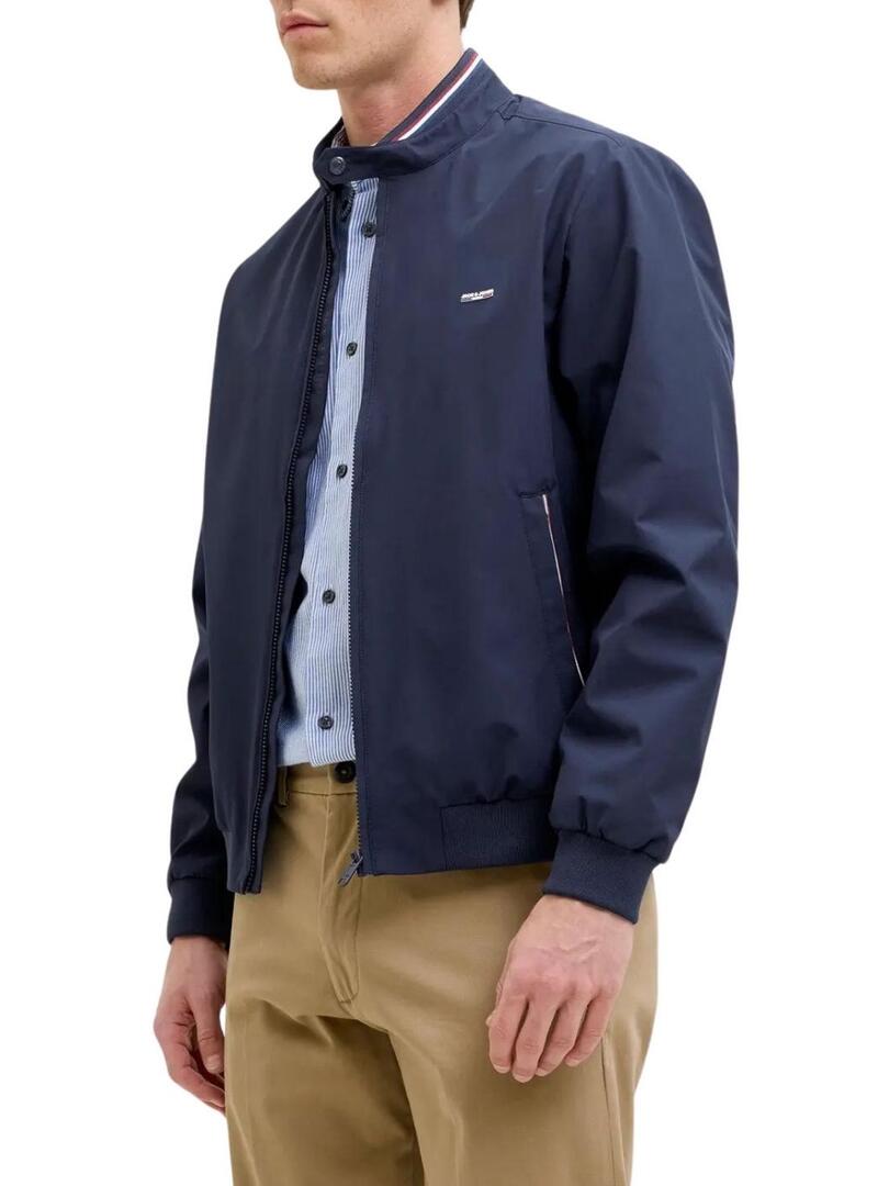 Bomber Jack and Jones. Modello Blubrad. Colore blu scuro. Collo alto. Orli a costine. Vestibilità regolare. Tasche laterali. Colletto con dettagli sportivi. Chiusura con zip.