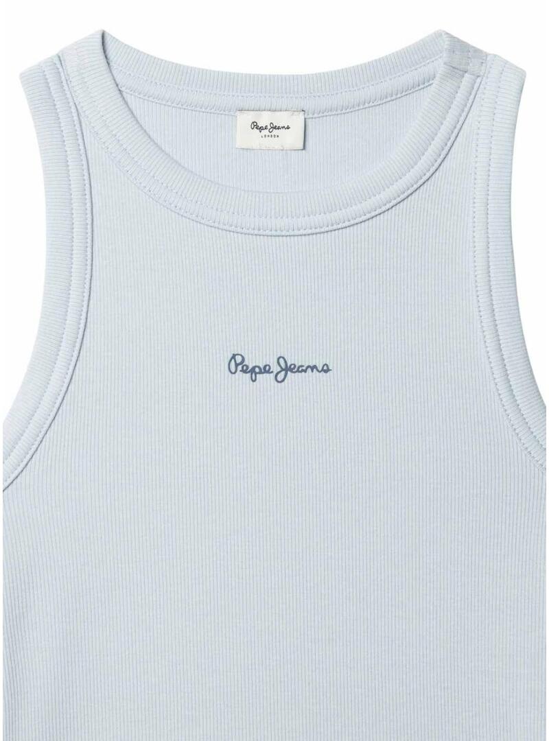 Maglietta Pepe Jeans. Colore turchese. Collo rotondo. Senza maniche. Tessuto a coste. Pepe Jeans sulla parte anteriore. Taglio aderente.