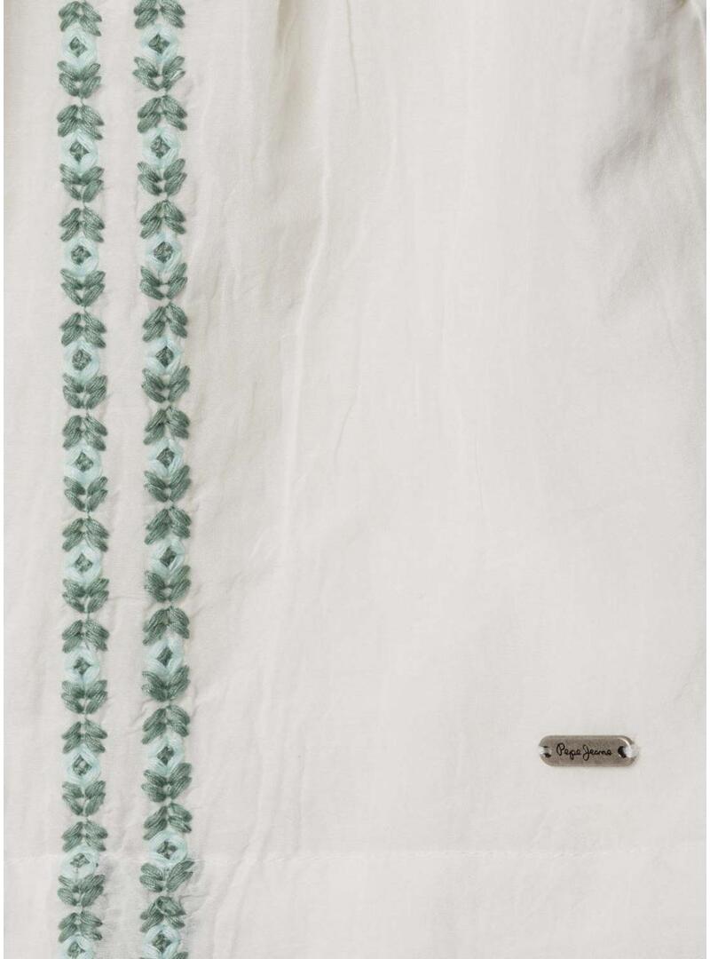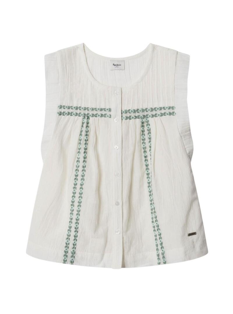 Camicetta Pepe Jeans. Colore bianco. Senza maniche. Colletto rotondo. Con pieghe. Dettagli ricamati in contrasto. Patta con bottoni sul davanti. Piastra di metallo con logo sul fondo.