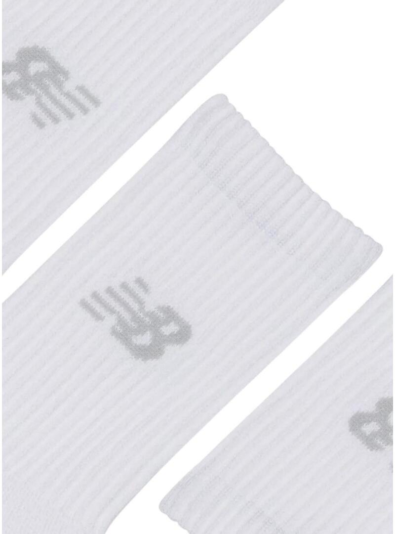 Pacco calze New Balance. Tre paia. Colore bianco. Lunghezza a metà polpaccio. Logo in colore grigio. Suola imbottita. Tecnologia antiodore e antibatterica. Asciugatura rapida NB DRY mantiene l'umidità lontano.