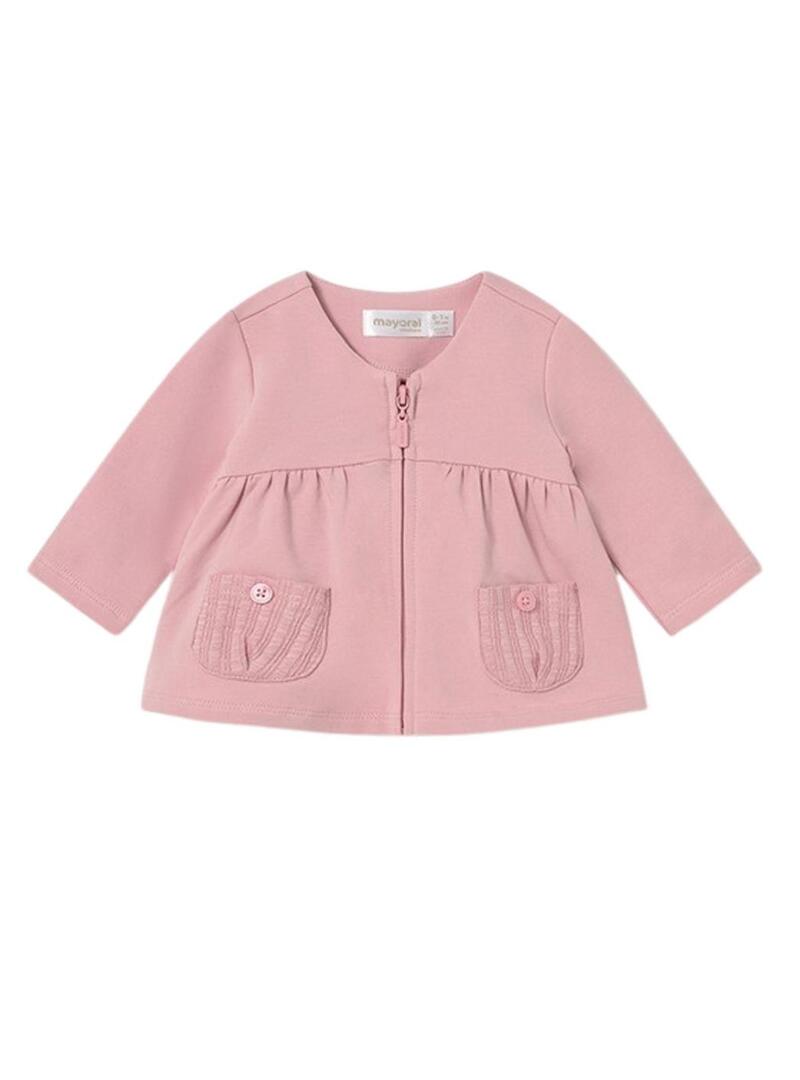 Set di 3 pezzi Mayoral. Colore rosa pastello. Include una maglietta bianca a manica corta con piccolo ricamo frontale. Giacca liscia con zip. Pantaloni con elastico in vita.