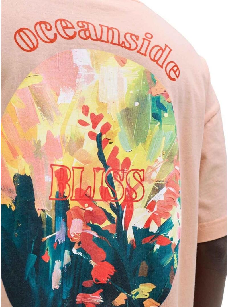Maglietta Jack and Jones. Modello Montauk. Colore rosa. Collo rotondo. Manica corta. Vestibilità ampia. Illustrazione stampata sulla schiena. Messaggio stampato sul petto.