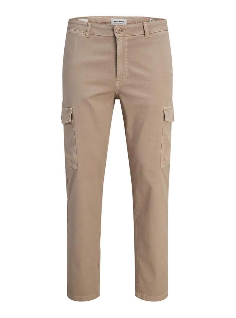 Pantaloni Jack and Jones. Modello Stace Arthur. Colore beige. Chiusura con bottone e zip. Stile cargo. Tasche con patta e bottone. Tasche laterali. Tasche posteriori. Vestibilità slim. Tessuto elastico.