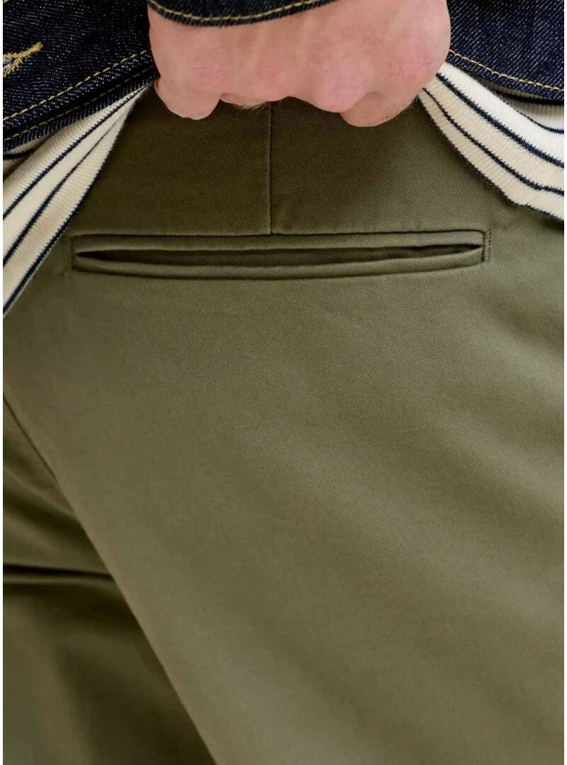 Pantaloni Jack and Jones. Modello Kane Chino. Colore verde. Chiusura con bottone e zip. Tasche laterali. Tasche a filetto posteriori. Taglio slim. Tessuto elastico.
