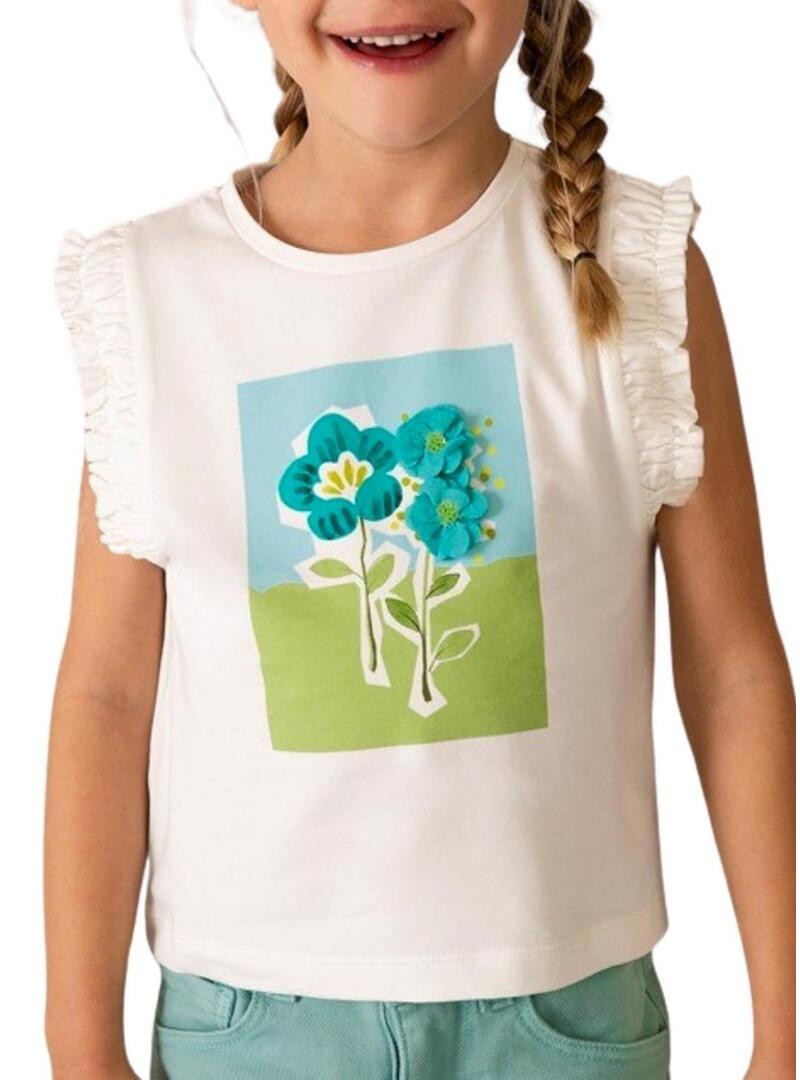 Maglietta Mayoral. Colore bianco sporco. Collo rotondo. Spalline larghe con finitura arricciata. Illustrazione floreale stampata sul davanti in blu e verde. Vestibilità dritta.