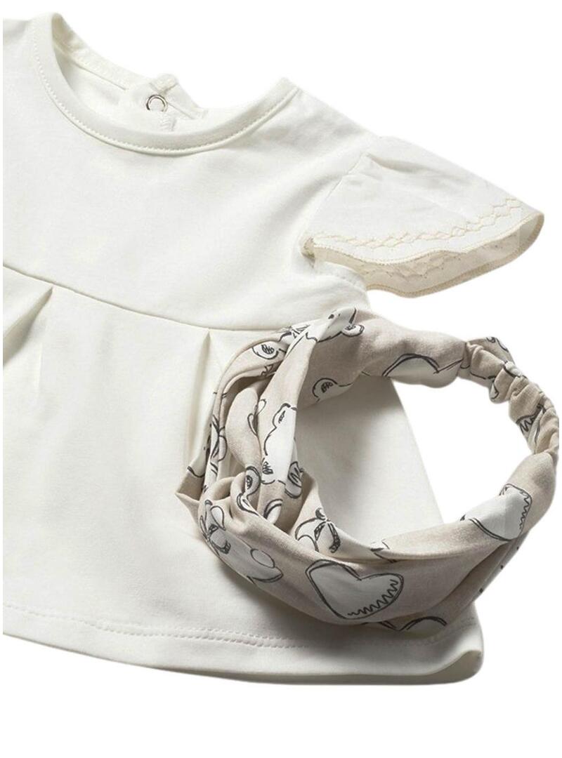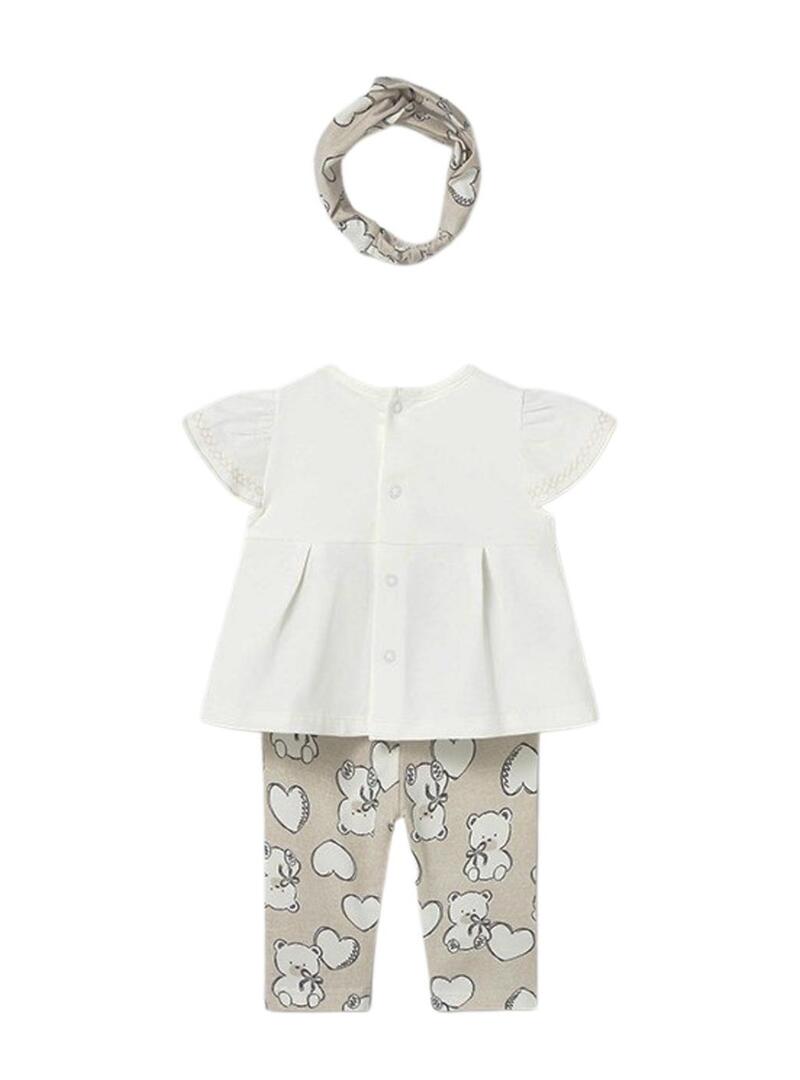 Set di tre pezzi Mayoral. Maglietta color crema con scollo rotondo, manica corta con volant e chiusura sul retro. Leggings con stampa di orsetti. Fascia per capelli coordinata.