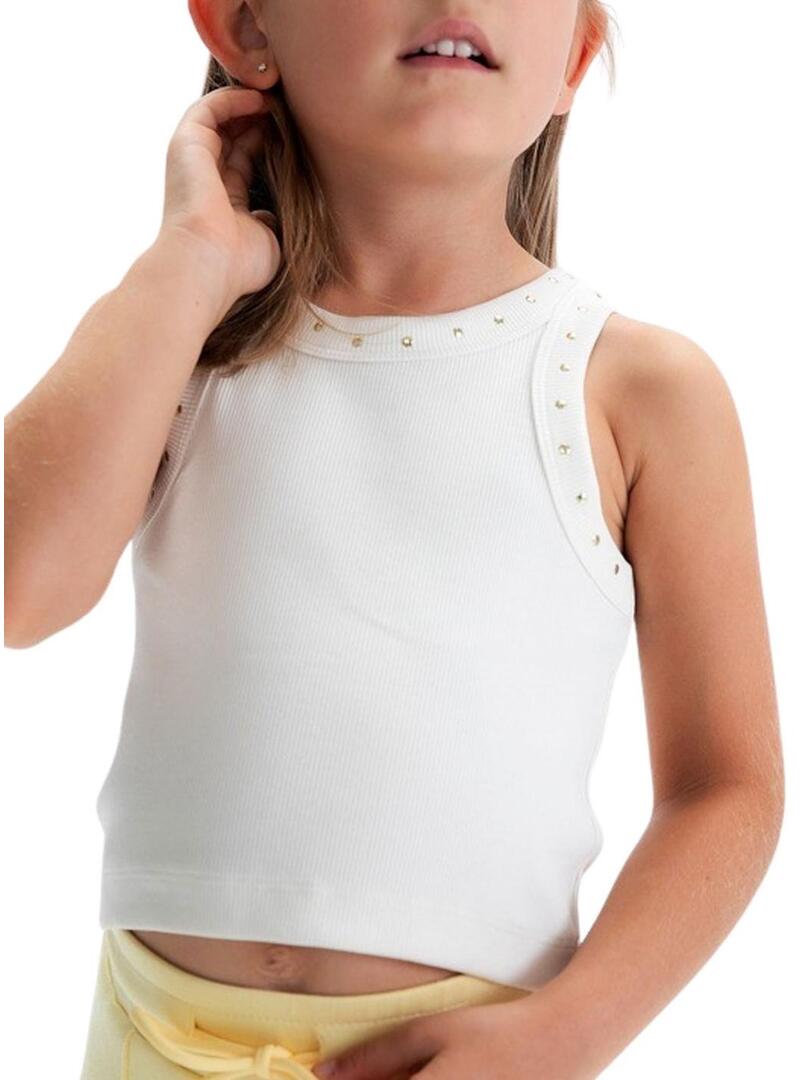 Maglietta Mayoral. Modello con borchie. Colore bianco sporco. Collo rotondo. Senza maniche. Taglio aderente. Tessuto a coste. Stile canotta.
