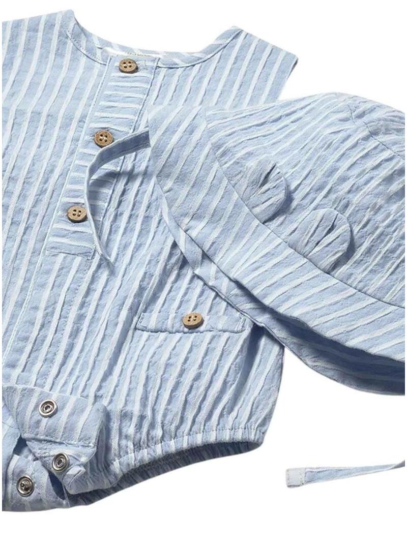 Tuta Mayoral a righe in celeste e bianco, ideale per le giornate estive del bambino con uno stile fresco e curato. Include un cappello abbinato e presenta un design senza maniche, chiusura frontale con bottoni e piccoli dettagli decorativi nella parte anteriore. Il suo tessuto leggero e il suo comfort lo rendono una scelta perfetta per il giorno o per occasioni speciali.