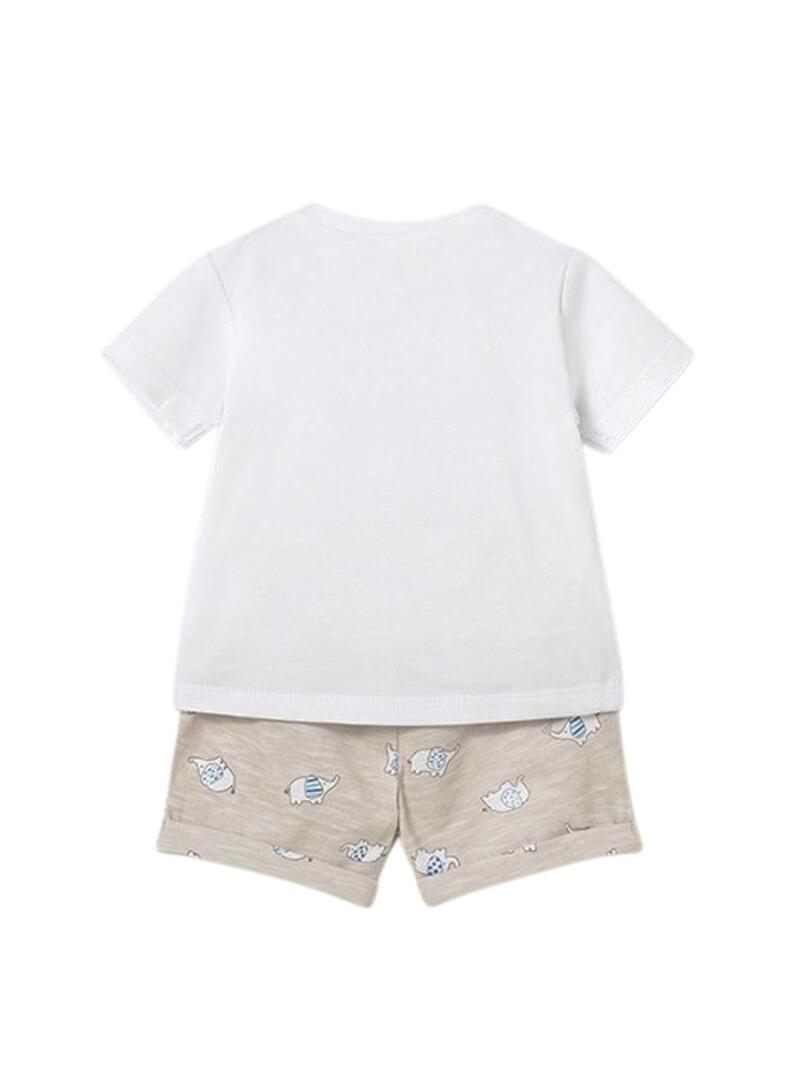 Set Mayoral con due look nei toni bianco, blu e beige, perfetto per l'estate del bambino. Include due magliette a maniche corte con dettagli ricamati di elefanti e due bermuda abbinati, una stampata e una tinta unita. Il suo design comodo e leggero è ideale per il quotidiano, permettendo di creare diverse combinazioni con uno stile tenero, fresco e molto pratico.