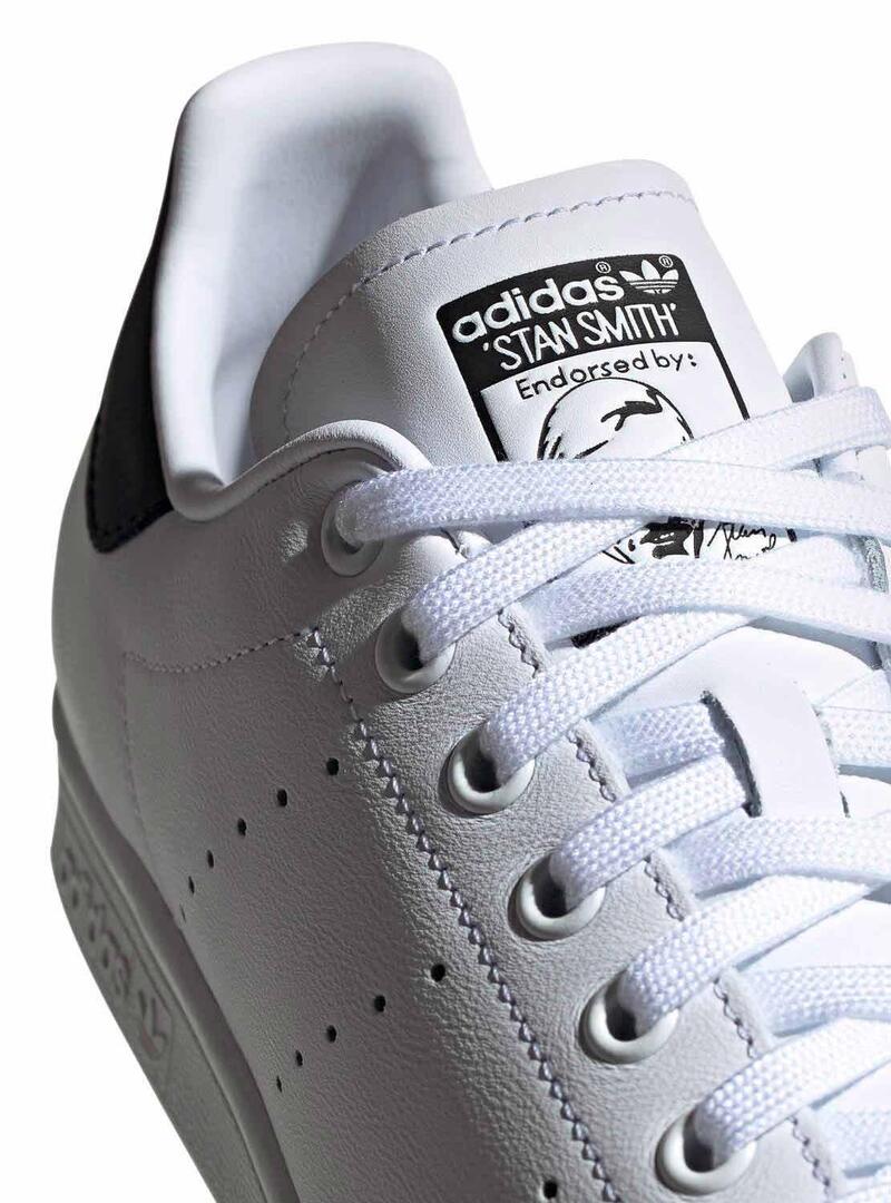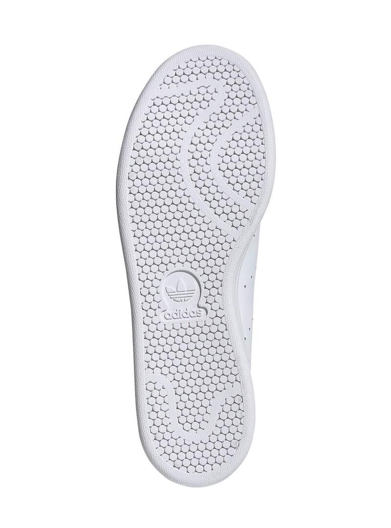 Scarpe Adidas. Modello Stan Smith. Colore bianco. Parte superiore in pelle morbida. 3 strisce perforate. Chiusura con lacci. Suola in gomma. Soletta OrthoLite. Lettere corsive ricamate sul tallone.